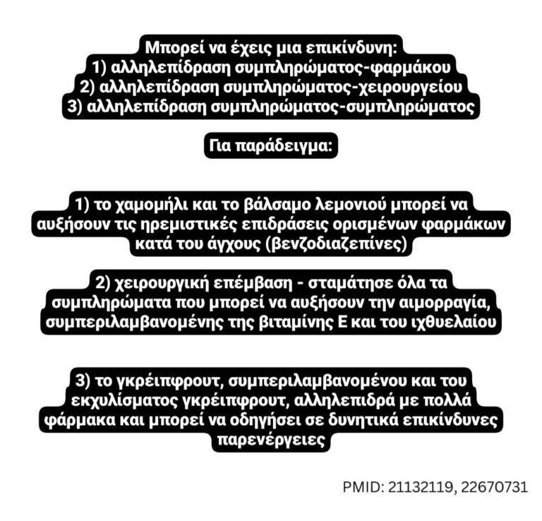 ΣΥΜΠΛΗΡΩΜΑΤΑ ΔΙΑΤΡΟΦΗΣ: Υπάρχουν πολλές αλληλεπιδράσεις συμπληρωμάτων – συμπληρωμάτων, συμπληρωμάτων – χειρουργικών επεμβάσεων και συμπληρωμάτων – φαρμάκων. Εάν παίρνετε οποιοδήποτε είδος φαρμάκου, συμπεριλαμβανομένου ενός φαρμάκου χωρίς ιατρική συνταγή ή εάν έχετε οποιοδήποτε είδος ασθένειας ή πάθησης, είναι πολύ σημαντικό να ρίξετε μια πιο προσεκτική ματιά στα συμπληρώματά σας και το πως μεταβολίζονται/λειτουργούν. Και να τα ελέγχετε τακτικά όταν αλλάζει οτιδήποτε. Ας υποθέσουμε ότι πλησιάζει μια χειρουργική επέμβαση, είναι σημαντικό να σταματήσετε να παίρνετε συμπληρώματα που μπορεί να αυξήσουν την αιμορραγία ή να αλληλεπιδράσουν με τα φάρμακα που σας δίνουν κατά τη διάρκεια ή και μετά της επέμβασης.