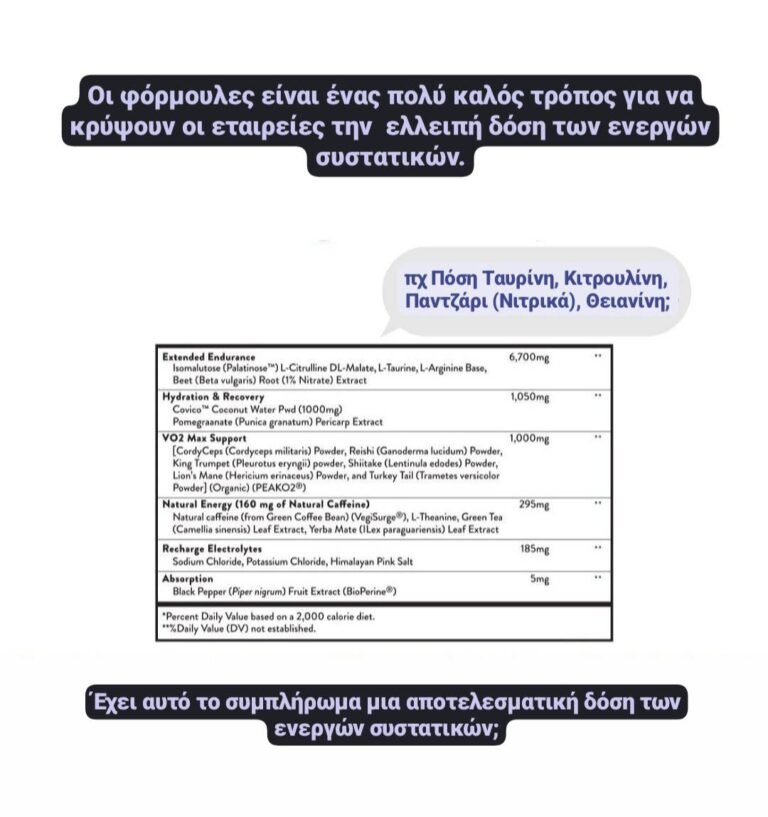Οι φόρμουλες και τα μείγματα (Ρroprietary Βlends) με διάφορα διατροφικά συστατικά ακούγονται συναρπαστικά, αποτελεσματικά και πρωτότυπα. Οι ποσότητες κάθε συστατικού πρέπει να αναφέρονται στον πίνακα Διατροφικής Δήλωσης (Διατροφική Ετικέτα) του συμπληρώματος (Supplement Facts), εκτός εάν χρησιμοποιείται κάποια φόρμουλα, η οποία είναι ένας συνδυασμός πολλών συστατικών. Με μια φόρμουλα, η εταιρεία μπορεί να αναφέρει τη συνολική ποσότητα των συστατικών σε σχέση με την ποσότητα κάθε συστατικού. Αυτό σημαίνει ότι μπορούν να ξεφύγουν με περισσότερα συστατικά πλήρωσης σε σχέση με τα πραγματικά ενεργά συστατικά. Μπορεί να μην γνωρίζετε εάν λαμβάνετε μια αποτελεσματική δόση των ενεργών συστατικών. Δεν υπάρχει τίποτα ωφέλιμο σε ένα Ρroprietary Βlend.