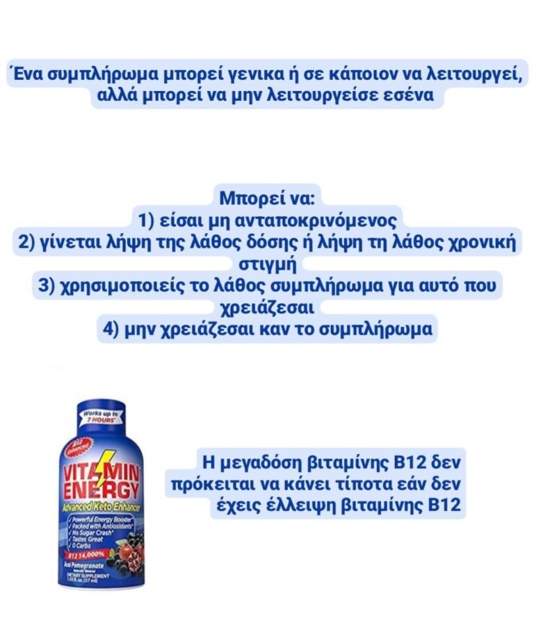 Ακριβώς επειδή ένα συμπλήρωμα λειτουργεί σε κάποιον, δεν σημαίνει ότι θα λειτουργήσει και για εσάς. Για παράδειγμα, εάν έχετε ήδη επαρκή ποσότητα Β12, η λήψη περισσότερης δεν πρόκειται να σας βοηθήσει.