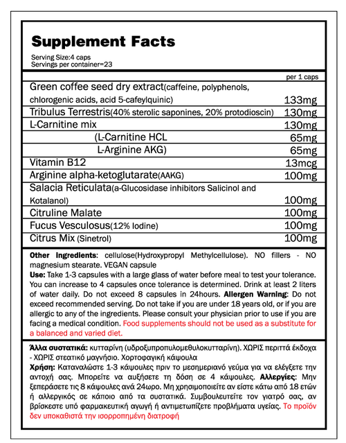 Dosage: Start by taking 1–3 capsules before lunch to test your tolerance. You can then increase the dose to 2 capsules in the morning and 2 capsules before your workout or lunch. Do not take more than 8 capsules per 24 hours.