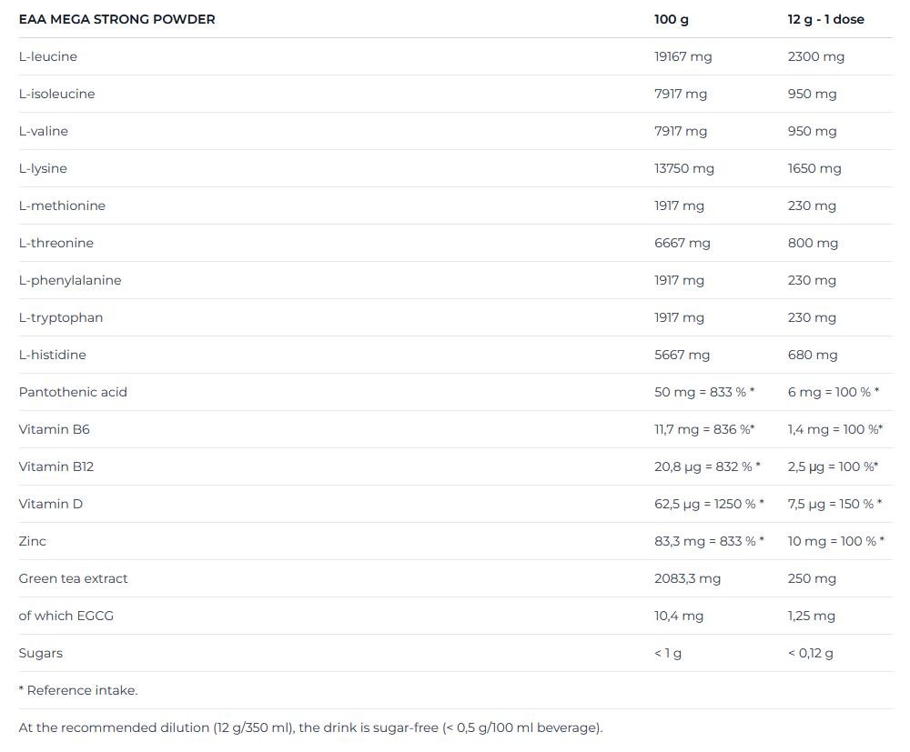 Το EAA Mega Strong Nutrend περιέχει και τα 9 απαραίτητα αμινοξέα, συμπεριλαμβανομένης της ομάδας αμινοξέων BCAA, λευκίνης, ισολευκίνης και βαλίνης. Τα αμινοξέα EAA δεν μπορούν να παραχθούν από τον ίδιο τον οργανισμό, αλλά τα χρειάζεται για να παράγει πρωτεΐνες που συμβάλλουν στην ανάπτυξη της μυϊκής μάζας. Το EAA Mega Strong Powder άμεσης απορρόφησης θα αναπληρώσει τα απαραίτητα EAA, χωρίς ζάχαρη, τεχνητές χρωστικές ουσίες ή γλουτένη. Επιπλέον, το παρασκευασμένο ρόφημα εξασφαλίζει την ενυδάτωση και ενισχύει το σώμα με βιταμίνες D, B5, B6 και B12. Περιέχει επίσης εκχύλισμα πράσινου τσαγιού και το μεταλλικό στοιχείο του ψευδάργυρου, που συμβάλλει στη σωστή πρωτεΐνοσύνθεση και στην υγεία των οστών.